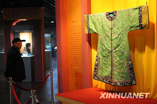 3月26日,參觀(guān)者在觀(guān)看一件清代后宮的綠緞繡百蝶衣。近日,南京博物院舉辦《太后吉祥――清代后宮御用品展》,展出清代后妃們御用的衣裙、旗鞋、珠翠飾品、玉器、瓷器以及封冊(cè)、字畫(huà)、工藝品和日用品等文物近百件,向參觀(guān)者展現(xiàn)清代后宮生活。