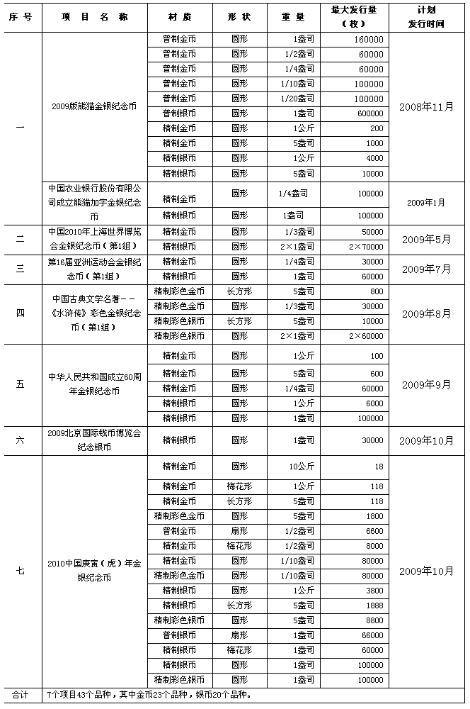 這7個(gè)項(xiàng)目分別為:2009版熊貓金銀紀(jì)念幣(其中包含中國(guó)農(nóng)業(yè)銀行股份有限公司成立熊貓加字金銀紀(jì)念幣)、中國(guó)2010年上海世界博覽會(huì)金銀紀(jì)念幣(第1組)、第16屆亞洲運(yùn)動(dòng)會(huì)金銀紀(jì)念幣(第1組)、中國(guó)古典文學(xué)名著——《水滸傳》彩色金銀紀(jì)念幣(第1組)、中華人民共和國(guó)成立60周年金銀紀(jì)念幣、2009北京國(guó)際錢(qián)幣博覽會(huì)紀(jì)念銀幣、2010中國(guó)庚寅(虎)年金銀紀(jì)念幣。上述項(xiàng)目中,2009版熊貓金銀紀(jì)念幣已于2008年11月發(fā)行。