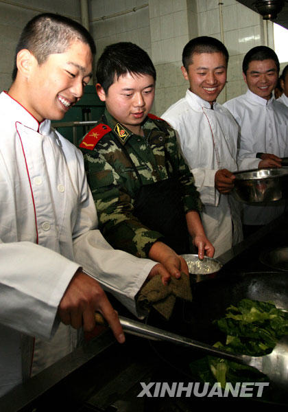 3月29日,河北衡水籍“90后”新戰(zhàn)士史軍帥(左一)在老兵的指導(dǎo)下幫廚燒菜。新華社記者:陳飛