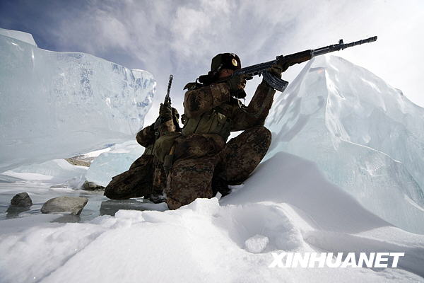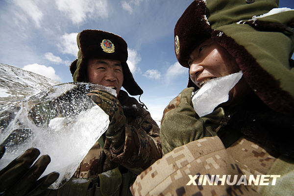 3月22日,官兵們?cè)诤0?546米的幕士塔格峰巡邏途中結(jié)合實(shí)戰(zhàn)訓(xùn)練時(shí)食冰塊解渴。
