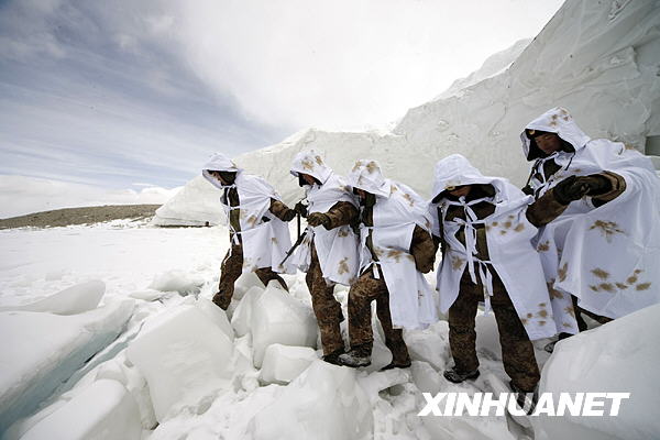 3月22日,官兵們巡邏在海拔7546米的幕士塔格峰。 |
