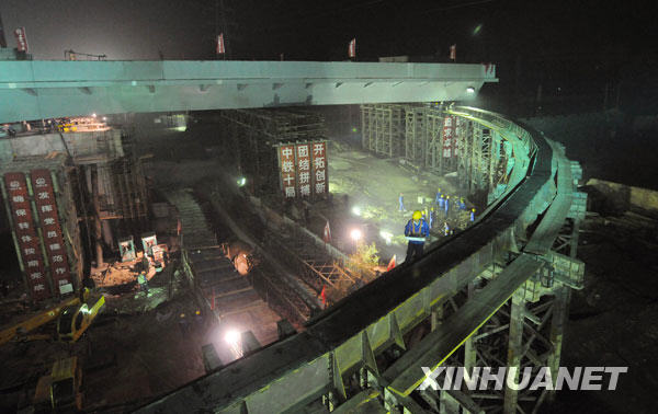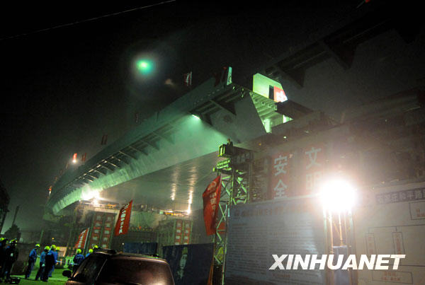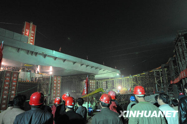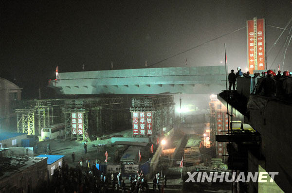 當日凌晨1點55分,經(jīng)過一個多小時的緊張工作,由中國中鐵十局承建的石家莊和平路高架橋跨鐵路鋼箱梁成功旋轉(zhuǎn)86度角,與鐵路兩側(cè)的橋梁實現(xiàn)成功對接。