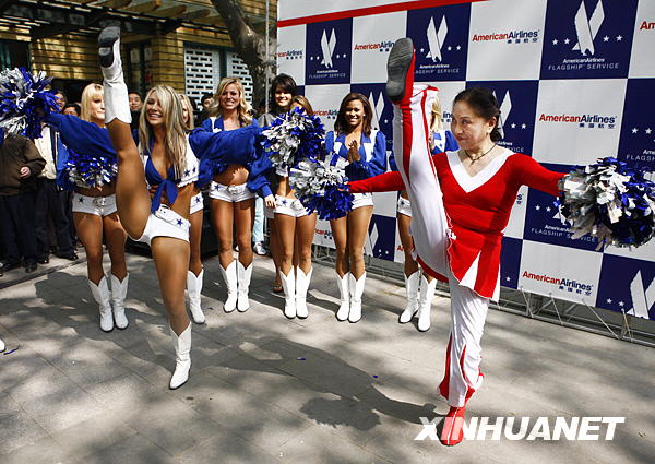 4月17日,美國橄欖球聯(lián)盟達(dá)拉斯牛仔隊(duì)的拉拉隊(duì)隊(duì)員與腰鼓隊(duì)隊(duì)員“切磋技藝”。新華社記者裴鑫攝