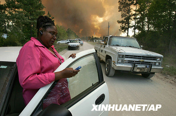 4月23日,在美國南卡羅來納州的霍里,一名婦女在山火襲來時(shí)給她的丈夫打電話。美國南卡羅來納州近日發(fā)生山火,已經(jīng)造成數(shù)十所房屋被毀,數(shù)百人離開家園。新華社/美聯(lián)
