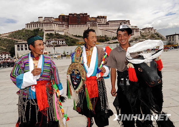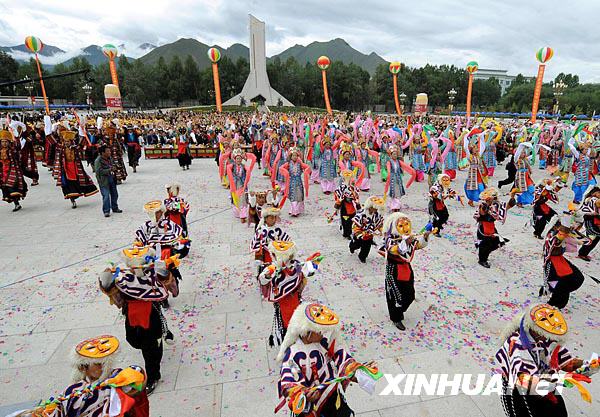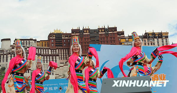 8月20日,人們?cè)诶_布達(dá)拉宮廣場(chǎng)上表演傳統(tǒng)藏戲及歌舞。