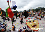 8月20日,拉薩市的小學(xué)生在布達(dá)拉宮廣場(chǎng)表演藏戲。新華社記者 格桑達(dá)瓦 攝 |
