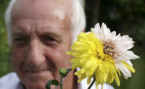 威廉安德伍德向記者展示他所種出的黃白雙色菊花。 據(jù)英國媒體8月23日報道,英國薩?丝ひ晃73歲退休卡車司機威廉安德伍德在自家花園中種出了一株雙色菊花。該菊花為黃白兩色,大小與普通菊花一樣。據(jù)植物學(xué)家介紹,出現(xiàn)雙色菊花主要是因為基因突變所致。