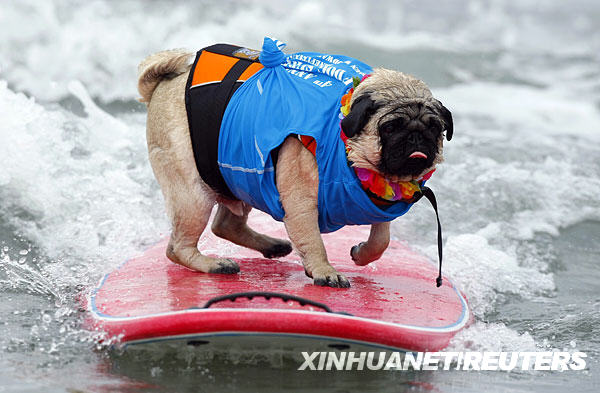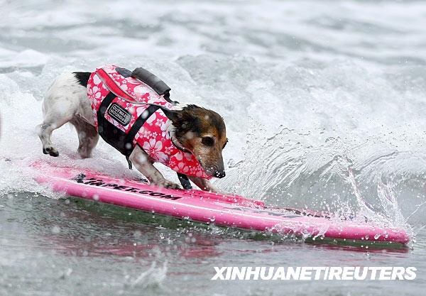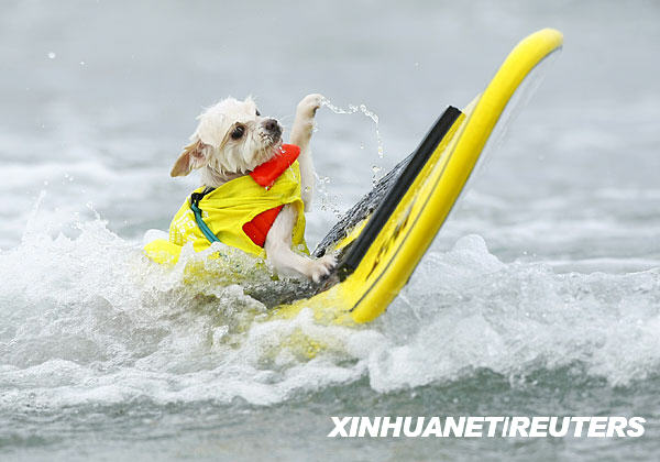 9月13日,在美國加利福尼亞州的德爾馬,一只8歲大的小狗體驗(yàn)沖浪。當(dāng)天,這里舉辦了一場狗狗沖浪大賽,旨在為流浪動(dòng)物籌集善款并喚起人們對寵物的愛心和責(zé)任感。