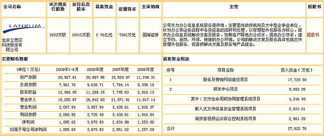 北京立思辰科技股份有限公司主營文件管理外包服務,注冊時間為1999年1月8日。公司董事長池燕明90年代初就開始從事復印相關的服務和產(chǎn)品銷售。根據(jù)公開資金顯示,立思辰在2004年之前主要從事復印機的代理銷售。 但是由于行業(yè)競爭激烈、利潤率降低,2004年之后公司借鑒國外文件管理外包的模式,轉型做一家服務性企業(yè)。模式就是企業(yè)將打印服務業(yè)務交給專業(yè)的服務提供商,進行"按需打印、按張收費",企業(yè)無須購買設備,而專業(yè)的服務商通過一系列技術手段,監(jiān)控所有的設備,提供全面的設備運營管理,幫助企業(yè)節(jié)省費用以及提高效率。 招股說明書顯示,公司近年處于快速成長階段。2006-2008年度營業(yè)收入分別為11817萬、21871萬、26842萬,復合增長率為50.72%;公司2006-2008年度凈利潤分別為1253萬、2694萬、3675萬,復合增長率為71.22%。 2009年上半年,公司銷售收入和利潤分別為15250萬和1885萬;不過招股說明書為提供08年同期的數(shù)據(jù)。 公司的辦公信息系統(tǒng)解決方案及服務客戶主要是于政府機構和多個行業(yè)的大中型企事業(yè)單位。 招股說明書顯示,2009年上半年,公司前五大客戶為內蒙庫勞動和社會保障廳、國家統(tǒng)計與、民生銀行(6.65,-0.11,-1.63%)、中石油(13.18,-0.23,-1.72%)西氣東送管道分公司、北京匯成嘉和科技有限公司,五大客戶占銷售總額的29.48%。 2008年公司的市場占有率為6.1%,居第二的位置,第一位的富士施樂市場占有率為17.04%。