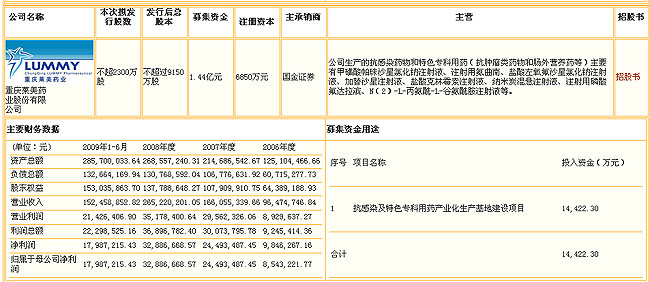 萊美藥業(yè)以研發(fā)、生產(chǎn)和銷售新藥為主,產(chǎn)品主要涵蓋抗感染類和特色?朴盟巸纱笙盗,主要產(chǎn)品有喹諾酮類抗感染藥、抗腫瘤藥、腸外營(yíng)養(yǎng)藥等。 招股說明書顯示,萊美藥業(yè)2009年上半年?duì)I業(yè)收入為1.52億元,凈利潤(rùn)為1798.72萬元,基本每股收益0.25元,歸屬于發(fā)行人股東的每股凈資產(chǎn)2.23元,全面攤薄凈資產(chǎn)收益率11.28%。資產(chǎn)負(fù)債率(合并報(bào)表口徑)46.43%。 次募集資金扣除發(fā)行費(fèi)用后,公司擬將募集資金投向抗感染及特色?朴盟幃a(chǎn)業(yè)化生產(chǎn)基地建設(shè)項(xiàng)目,該項(xiàng)目總投資額為14,422.30萬元。如果本次發(fā)行實(shí)際募集資金量不能滿足上述項(xiàng)目資金需求,不足部分由公司自籌解決;如本次發(fā)行實(shí)際募集資金量超過項(xiàng)目的資金需求量,公司擬將富余的募集資金主要用于補(bǔ)充募投項(xiàng)目建設(shè)和生產(chǎn)所需要的流動(dòng)資金。 如募集資金在補(bǔ)充完上述募集資金投資項(xiàng)目的流動(dòng)資金后仍有余額,則將用于補(bǔ)充公司經(jīng)營(yíng)所需的流動(dòng)資金、償還銀行貸款。 目前,邱宇是萊美藥業(yè)的控股股東、實(shí)際控制人。本次發(fā)行前,邱宇先生持有公司2,063.90萬股股份,占公司總股本的30.13%。自然人股東43人,其中31人為中高層核心管理人員和業(yè)務(wù)骨干。 截至本招股書簽署日,邱宇除持有萊美藥業(yè)30.13%的股權(quán)外,還持有藥友科技32.67%的股權(quán)。