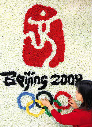 | 北京奧運花卉配送中心的插花師制作“中國印”插花作品。崔浩