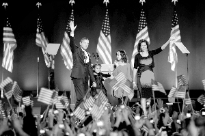 | 4日,在美國芝加哥格蘭特公園,美國民主黨總統(tǒng)候選人奧巴馬(左一)與家人在選舉夜活動(dòng)現(xiàn)場向支持者揮手致意