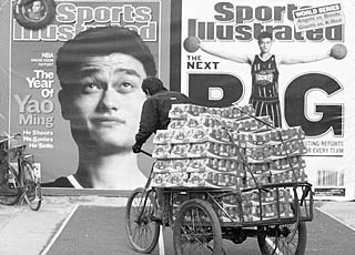 上海,一位工人正用力踏著一輛裝滿可口可樂(lè)的人力車行駛在街頭,車旁是一幅印有姚明頭像的美國(guó)NBA體育雜志的廣告。2008年12月14日晚,由大學(xué)生組成的社會(huì)調(diào)查小組,在北京中央民族大學(xué)發(fā)布《可口可樂(lè)調(diào)查報(bào)告》,稱可口可樂(lè)嚴(yán)重侵害派遣工利益,呼吁姚明、劉翔停止為可口可樂(lè)代言。CFP供圖 |