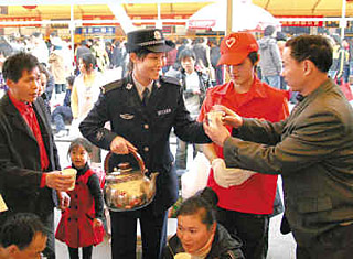 | 一月十四日,廈門鐵路民警在廈門火車站為購(gòu)票、候車的旅客提供茶水。新華社記者 項(xiàng)開來