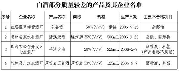 白酒行業(yè)抽查出的主要問題有:個別產(chǎn)品雜醇油含量超標;個別產(chǎn)品酒精度達不到明示要求;乙酸乙酯含量不符合標準要求;個別產(chǎn)品總酯達不到標準要求;固形物指標不符合標準要求。