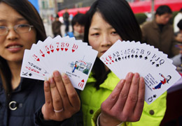 3月6日,兩名女青年在展示“外出務(wù)工婦女安全須知”宣傳撲克牌。當(dāng)日,安徽省“三八”維權(quán)月活動(dòng)正式啟動(dòng)。安徽省婦聯(lián)將開(kāi)展“春風(fēng)送崗位”“送法律下鄉(xiāng)”等系列活動(dòng),重點(diǎn)對(duì)青年婦女和兒童進(jìn)行維權(quán)宣傳。 |