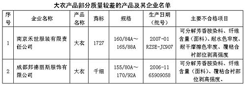 大衣產(chǎn)品抽查中發(fā)現(xiàn)的主要質(zhì)量問題有,個(gè)別產(chǎn)品含有禁用的可分解芳香胺染料;有部分產(chǎn)品面料、里料纖維含量不合格,主要是面料或里料的纖維含量明示標(biāo)識(shí)與實(shí)測結(jié)果不符,有的產(chǎn)品面料明示標(biāo)識(shí)為羊毛80%,駝毛20%,但實(shí)測結(jié)果為羊毛含量僅為50.3%,另有12%的兔毛和37.7%的腈綸;有部分產(chǎn)品耐水色牢度和干摩擦色牢度不合格,這樣的產(chǎn)品在穿著過程中,如遇到汗?jié)n、雨水等會(huì)使面料褪色。