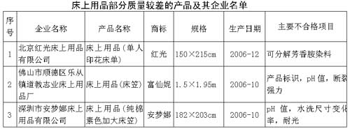床上用品抽查中發(fā)現(xiàn)的主要質(zhì)量問題有,首先,強(qiáng)制性國家標(biāo)準(zhǔn)規(guī)定對服裝用和裝飾用紡織產(chǎn)品禁用可分解芳香胺染料,可分解芳香胺染料是關(guān)系到使用者人身健康安全的指標(biāo),抽查中有個(gè)別產(chǎn)品含有禁用的可分解芳香胺染料。其次,強(qiáng)制性國家標(biāo)準(zhǔn)規(guī)定,直接接觸皮膚類產(chǎn)品的pH值應(yīng)在4.0至7.5范圍內(nèi),抽查中有部分產(chǎn)品pH值超過國家標(biāo)準(zhǔn)規(guī)定的要求,pH值呈堿性。再次,斷裂強(qiáng)力和水洗尺寸變化率項(xiàng)目是衡量床上用品使用性能的主要指標(biāo),抽查中發(fā)現(xiàn)有部分產(chǎn)品斷裂強(qiáng)力和水洗尺寸變化率不合格。另外,抽查中有部分產(chǎn)品標(biāo)識(shí)標(biāo)注不規(guī)范,主要是沒有標(biāo)注產(chǎn)品基本安全類別、標(biāo)準(zhǔn)編號(hào)、產(chǎn)品等級等。