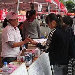 | 黑龍江大學(xué)9月10日新生報(bào)到注冊(cè),各大通訊商、手機(jī)經(jīng)銷商忙在校園擺攤促銷。新華社記者 鄭啟航