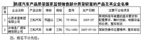 日前,國家質(zhì)檢總局對(duì)低速汽車產(chǎn)品質(zhì)量進(jìn)行了國家監(jiān)督抽查,共抽查了河北、山西、江蘇、浙江、江西、福建、山東、河南、四川、安徽、廣西等11個(gè)省、自治區(qū)28家企業(yè)生產(chǎn)的28種產(chǎn)品(不涉及出口產(chǎn)品),產(chǎn)品實(shí)物質(zhì)量合格率為92.9%。 依據(jù)相關(guān)的國家強(qiáng)制性標(biāo)準(zhǔn)及推薦性標(biāo)準(zhǔn),此次抽查對(duì)低速汽車的行車制動(dòng)性能(滿載)、駐車制動(dòng)性能、燃料系統(tǒng)及排氣管、安全防護(hù)要求、自卸裝置、轉(zhuǎn)向及限位裝置、滿載最高車速、車輛外廓尺寸、車輛后懸、使用說明書等21個(gè)項(xiàng)目進(jìn)行了檢驗(yàn)。 抽查結(jié)果表明,連續(xù)多年的國家監(jiān)督抽查促進(jìn)了企業(yè)質(zhì)量意識(shí)的提高,產(chǎn)品質(zhì)量保持穩(wěn)定;此外,市場(chǎng)占有率較高的大、中型企業(yè)的產(chǎn)品質(zhì)量較好。 抽查中發(fā)現(xiàn)的主要質(zhì)量問題是整車標(biāo)志、圖形和文字標(biāo)志不符合標(biāo)準(zhǔn)規(guī)定。國家強(qiáng)制性標(biāo)準(zhǔn)規(guī)定,低速汽車產(chǎn)品標(biāo)牌內(nèi)容應(yīng)規(guī)范齊全,車輛識(shí)別代碼、發(fā)動(dòng)機(jī)編號(hào)打刻位置應(yīng)在說明書中指明,三輪汽車的變速桿、手柄和開關(guān)等操縱機(jī)構(gòu)應(yīng)有耐久性標(biāo)志明確標(biāo)明其功能等。抽查中有個(gè)別產(chǎn)品標(biāo)牌內(nèi)容不全,車輛識(shí)別代碼、發(fā)動(dòng)機(jī)編號(hào)位置與說明書指明位置不符,燈具開關(guān)無圖形和文字標(biāo)志等。