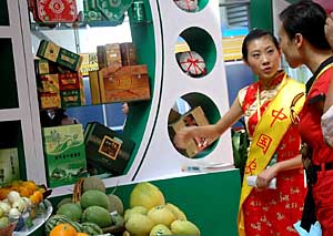 | 10月28日,第四屆中國-東盟博覽會(huì)上,中國廣西農(nóng)墾集團(tuán)工作人員向客人介紹中國綠色農(nóng)產(chǎn)品。新華社發(fā)(楊紹功