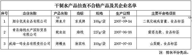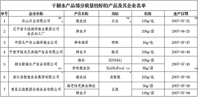 國(guó)家質(zhì)檢總局日前對(duì)水產(chǎn)品行業(yè)進(jìn)行抽查,共查了河北、天津、遼寧、上海、浙江、福建、山東等七個(gè)省、直轄市58家企業(yè)生產(chǎn)的65種產(chǎn)品(不涉及出口產(chǎn)品),產(chǎn)品實(shí)物質(zhì)量合格率為95.4%。 此次抽查的干制水產(chǎn)品主要有烤魚(yú)片、魷魚(yú)絲、風(fēng)味魚(yú)干、紫菜、蝦皮、蝦米、干貝、魷魚(yú)干等。依據(jù)GB10144-2005《動(dòng)物性水產(chǎn)干制品衛(wèi)生標(biāo)準(zhǔn)》等強(qiáng)制性國(guó)家標(biāo)準(zhǔn)及相關(guān)產(chǎn)品標(biāo)準(zhǔn)規(guī)定的要求,對(duì)干制水產(chǎn)品的感官、無(wú)機(jī)砷、鉛、甲基汞、酸價(jià)、過(guò)氧化值、亞硫酸鹽、苯甲酸、山梨酸、多氯聯(lián)苯、菌落總數(shù)、大腸菌群、霉菌、沙門(mén)氏菌、金黃色葡萄球菌、副溶血性弧菌、志賀氏菌以及食品標(biāo)簽等18個(gè)項(xiàng)目進(jìn)行了檢驗(yàn)。 抽查結(jié)果表明,一是連續(xù)多年的國(guó)家監(jiān)督抽查促進(jìn)了企業(yè)質(zhì)量意識(shí)的提高,產(chǎn)品質(zhì)量保持穩(wěn)定;二是市場(chǎng)占有率較高的大型企業(yè)的產(chǎn)品實(shí)物質(zhì)量合格率為100%。 抽查中發(fā)現(xiàn)的主要質(zhì)量問(wèn)題: