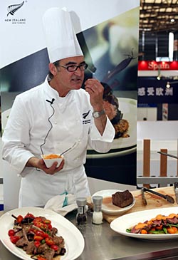 | 近日在上海舉行的中國(guó)國(guó)際食品飲料和酒店用品展上,來自23個(gè)國(guó)家和地區(qū)的800多家參展商展示了各類進(jìn)口鮮果、罐頭食品、飲料等產(chǎn)品。圖為來自新西蘭的廚師在向觀眾展示新西蘭美食。本報(bào)記者