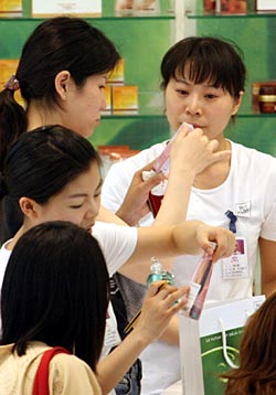 本報資料照片 | 近期,一直以高價姿態(tài)“屹立”在中國市場上的高檔進口化妝品品牌的銷售策略似乎開始動搖,與此同時,由國外品牌力推的無添加、精油等新概念正在化妝品市場掀起熱潮。專家表示,雖然國內(nèi)消費者在化妝品方面的支出越來越大,但是不少消費者在化妝品方面還存在誤區(qū):一方面,國內(nèi)消費者一味青睞國外品牌,使化妝品市場出現(xiàn)幾乎被國外品牌全盤壟斷的局面;另一方面,消費者大多只看化妝品的短期功效,不注重從內(nèi)而外的護理。