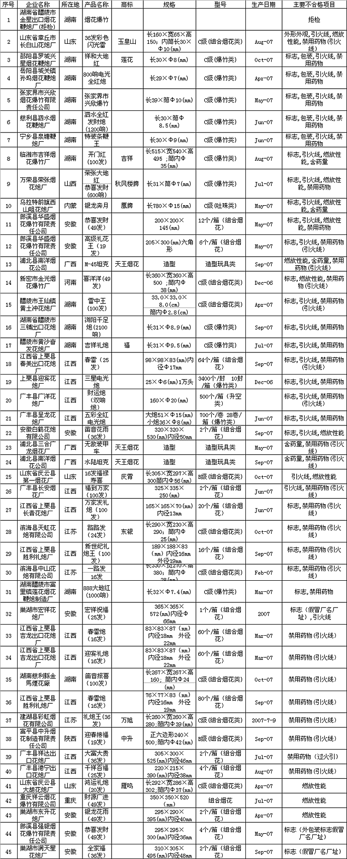 煙花爆竹部分質(zhì)量較差的產(chǎn)品及其企業(yè)名單