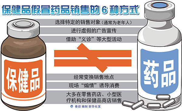 記者在采訪中了解到,保健品假冒藥品主要是通過在產(chǎn)品名稱、外包裝、功能和廣告宣傳上做文章,消費(fèi)者需要小心辨別。 一是在產(chǎn)品名稱上做文章。1、從名稱上暗示對某種疾病有獨(dú)特的療效,如“耳貼靈”“骨質(zhì)增生一貼靈”“腳癬一次凈”“菌必凈”等。2、名稱高度仿藥品,如“慢炎舒檸”“慢咽舒寧”(仿國藥準(zhǔn)字“慢嚴(yán)舒檸”)、“甘草片”(仿復(fù)方甘草片)、“雙黃蓮口服液”(仿雙黃連口服液)、“666皮炎平”(仿999皮炎平)等。3、直接用藥品名稱來命名,如使用已有藥品名稱川貝枇杷膏、婦科千金膠囊等。 二是在外包裝上做文章。1、仿造藥品包裝的圖案、風(fēng)格。2、標(biāo)示有藥品特有的標(biāo)志,如藥典中收錄的主要成分、OTC標(biāo)志、外用藥標(biāo)志等。3、在包裝、標(biāo)簽、說明書上標(biāo)示“藥”“純中藥”“藏藥”等字樣。 三是在生產(chǎn)企業(yè)名稱上做文章。多仿藥品生產(chǎn)企業(yè)名稱,且有的產(chǎn)品確為藥品生產(chǎn)企業(yè)生產(chǎn)的。常見的有醫(yī)藥生物公司、藥業(yè)公司、制藥公司、生物制品公司、保健品公司等。 四是在功能上做文章。1、在包裝標(biāo)志及說明書中直接標(biāo)示[功能主治][適應(yīng)證][用法用量]。2、主要成分均為藥典收載品種,在說明書中對主要成分分別描述功能主治、適應(yīng)證,以暗示整個(gè)產(chǎn)品的治療作用。3、超出保健功能暗示對各種疾病有治療作用,有的甚至對療效作出承諾,其宣稱的適應(yīng)范圍不但超出保健范圍,甚至超過同類藥品的適應(yīng)范圍。主要集中在有關(guān)各類皮膚疾病、婦科疾病、糖尿病、心腦血管病、痔瘡、燒燙傷、跌打損傷等方面的產(chǎn)品,有些還宣稱能治療消化不良、鼻炎、鼻竇炎等。