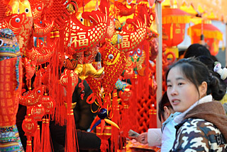 市民在南京夫子廟年貨大街選購(gòu)民間工藝飾品。本報(bào)記者 孫參 攝 |