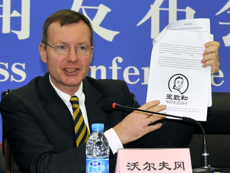 3月29日,德國律師沃爾夫?qū)┦空故镜聡鴼W凱公司惡意搶注的王致和商標(biāo)。