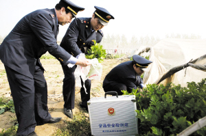 近日,來自北京市工商局通州分局的食品檢測員與河北省香河縣工商局執(zhí)法人員聯(lián)手對蔬菜種植基地、批發(fā)市場上銷售的蔬菜進行了抽檢,將監(jiān)管關(guān)口前移到田間地頭,以確保進京食品源頭的安全。焦艷玲 攝