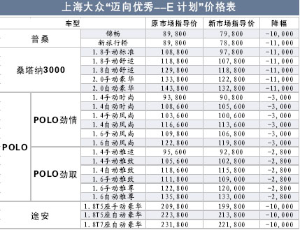 上海大眾相關(guān)人士表示,降價是為配合其新推行的主動營銷模式而進(jìn)行的。降幅最大的是桑塔納3000車型,5款車型廠家指導(dǎo)價全部下調(diào)1.1萬元。降價調(diào)整后1.8手動標(biāo)準(zhǔn)型的桑塔納3000售價降為9.78萬元,跌入10萬元區(qū)間(詳見附表)。對一直銷量不錯的帕薩特領(lǐng)馭,廠家沒有直接降價,而是執(zhí)行1個半月的優(yōu)惠促銷,對活動期間購車的用戶贈送6萬公里免費(fèi)常規(guī)保養(yǎng),購買1.8T車型的消費(fèi)者可獲8000元保險。 上海大眾北京地區(qū)經(jīng)銷商表示,此次廠家的降價幅度比較大,因為此前4S店的銷售價格優(yōu)惠幅度也只有廠家降幅的一半到三分之二,因此,降價有比較實在的讓利。