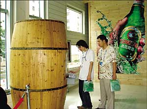 游客在青啤博物館內(nèi)參觀釀酒大桶。 | 日前,青島啤酒公司與世界旅游組織簽訂戰(zhàn)略合作協(xié)議,繼微軟之后,成為世界旅游組織的第二個(gè)合作伙伴。