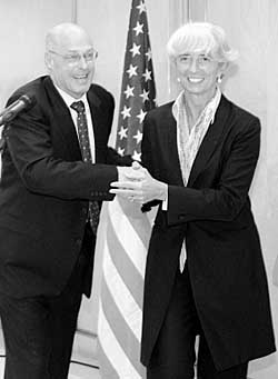 | 美國(guó)財(cái)長(zhǎng)保爾森(左)與法國(guó)財(cái)政部長(zhǎng)拉加德會(huì)晤