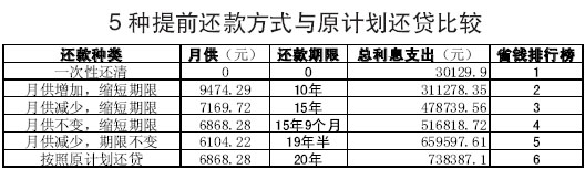 第五種,部分提前還款,增加月供,縮短還款期限。 提前還款10萬(wàn)元,月供增加為9474.29元,還款期限縮短為10年,提前還款后總利息為311278.35元。 利息總額=30129.9+281148.45=311278.35元 業(yè)內(nèi)人士分析指出,縮短貸款期限是節(jié)省利息的關(guān)鍵因素。從上述計(jì)算結(jié)果來(lái)看,還款期限15年與10年相比總利息支出相差近16萬(wàn)多元。而還款期限20年與10年相比更是多支付了高達(dá)42萬(wàn)多元的利息,這筆費(fèi)用對(duì)于一個(gè)工薪家庭來(lái)講還是相當(dāng)可觀的。因此房貸消費(fèi)者一定要重視較長(zhǎng)的還貸年限所帶來(lái)的高額利息支出,根據(jù)自身經(jīng)濟(jì)情況盡量縮短還款年限,從而減少利息支出。 |