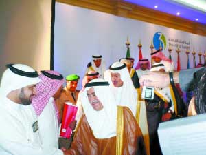 | 14日在新聞發(fā)布會(huì)開始前,沙特石油部長納伊米受到媒體“圍攻” 本報(bào)記者 朱周良