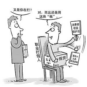 “經(jīng)營(yíng)者提供商品或者服務(wù)有欺詐行為的,應(yīng)當(dāng)按照消費(fèi)者的要求增加賠償其受到的損失,增加賠償?shù)慕痤~為消費(fèi)者購(gòu)買(mǎi)商品的價(jià)款或者接受服務(wù)的費(fèi)用的一倍!1995年,當(dāng)王海依照這一條款,贏了那次著名的索賠官司之后,12年中這樣的故事不斷重演,甚至有人認(rèn)為職業(yè)打假者成了一個(gè)特殊群體。