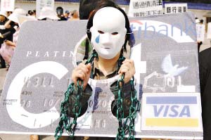 2007年6月,一名女子在中國臺北街頭將頭和戴著枷鎖的手放在信用卡模型中,告誡人們警惕信用卡依賴癥。 | 本報綜合報道