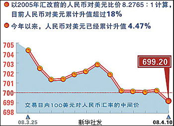 再?gòu)耐庖蚩,美元加速貶值,也推動(dòng)了人民幣匯率較快升值。受次貸危機(jī)等因素影響,國(guó)際金融市場(chǎng)上美元不斷走貶。今年一季度,美元對(duì)日元最多時(shí)貶值13.3%,對(duì)歐元最多時(shí)貶值7.5%。由于人民幣匯率參考一籃子貨幣進(jìn)行調(diào)節(jié),在一籃子貨幣中,大頭還是美元。美元持續(xù)貶值,人民幣就會(huì)不斷升值。