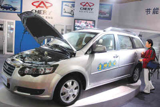 | 圖為北京環(huán)保節(jié)能車展上,奇瑞汽車公司推出的生物柴油新型能源動(dòng)力汽車。博芽