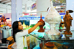 | 第五屆中國-東盟博覽會(huì)將于22日至25日在南寧舉辦,圖為來自泰國的一名客商在展位上布置參展的工藝品