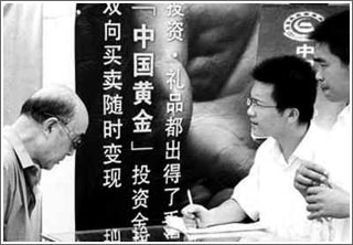 一年開設47家分公司,這是寶鑫金業(yè)創(chuàng)造的布點速度。 成立于2006年9月的寶鑫金業(yè),是一家注冊資本500萬元,經營范圍涵蓋黃金、鉑金飾品的加工、銷售,珠寶、玉器的銷售以及黃金交易代理及咨詢服務的新企業(yè)。 這樣一家名不見經傳的公司,為何能快速布點并誘導大量投資者“上鉤”呢?記者調查發(fā)現(xiàn),這主要是因為寶鑫金業(yè)惡意利用了三大“誘餌”: 誘餌一——企業(yè)品牌!案]x”品牌創(chuàng)建于1984年。公司下設六家專業(yè)首飾生產加工基地和一個檢測中心,已形成集團化、專業(yè)化的珠寶首飾加工、出口、內銷的經營網絡,是國內首家在港上市的珠寶企業(yè),也是上海黃金交易所綜合類會員單位。為取得投資者的信任,寶鑫金業(yè)在“客戶協(xié)議書”中大肆宣傳所謂的“福輝標準金延期交收業(yè)務”,給人此項業(yè)務與福輝公司密切相關的誤導。對此,福輝公司強調,公司并無此項業(yè)務。 誘餌二——公司授權。為使投資者深信不疑,寶鑫金業(yè)特別將福輝公司的“授權書”放在“客戶協(xié)議書”的突出位置!笆跈鄷狈Q:“茲授予福建省寶鑫金業(yè)有限公司代理福建省福輝珠寶有限公司開展上海黃金交易所黃金延期交收及咨詢業(yè)務。時間為2007年3月1日至2008年2月28日!蓖顿Y者也因此打消了顧慮。 誘餌三——辦公場所。為了制造“福輝和寶鑫是合作伙伴”的假象,寶鑫金業(yè)還租下了福輝珠寶城四樓A區(qū)的辦公場地,設立了“寶鑫黃金交易中心”,從事所謂“福輝標準金延時交收業(yè)務”的交收及咨詢業(yè)務。許多投資者正是到現(xiàn)場參觀后,才充分相信寶鑫公司,并大膽參與此項投資。