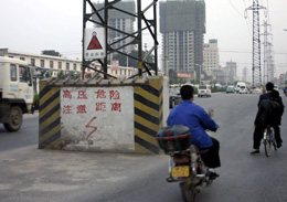 10月17日,在西安市朱宏路,一排電線桿“霸道”地分布在機(jī)動(dòng)車(chē)道中央。 西安市一些街道拓寬改造之后,電線桿卻沒(méi)有及時(shí)挪移,形成交通安全隱患,在夜晚、雨霧等視線不良的條件下時(shí)常引發(fā)交通事故。