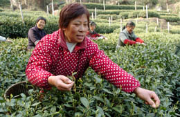 2007年3月6日,翁家山村的茶農(nóng)正在采摘西湖龍井茶。由于暖冬氣候,茶農(nóng)提前迎來西湖龍井茶的采摘期。 本報(bào)記者:王定昶