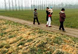 2005年1月27日上午,在河南省夏邑縣曹集鄉(xiāng)馬莊村,幾位婦女經(jīng)過一片被凍壞的麥田。全國商品糧基地縣河南省夏邑縣該年小麥種植面積達(dá)100萬畝,遭受凍害的小麥達(dá)60萬畝,其中15萬畝受凍程度嚴(yán)重。(本報(bào)資料照片) |