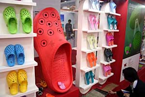 鞋業(yè)已成為晉江的支柱產(chǎn)業(yè)之一。2007年4月19日,在福建晉江開幕的第九屆中國(晉江)國際鞋業(yè)博覽會上,一只1.1米長的大拖鞋引人注目。本報資料照片 | 民企風(fēng)向標(biāo)集體轉(zhuǎn)向上市