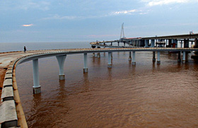 寧波港是我國國際集裝箱運(yùn)輸?shù)母删港,又是上海國際航運(yùn)中心的重要一員。根據(jù)國家規(guī)劃,上海國際航運(yùn)中心由洋山港與長江沿岸港口和寧波港三者組成,功能互補(bǔ),是上海國際航運(yùn)中心的“中心兩翼”。然而由于杭州灣的阻隔,寧波港與上海港、太倉港交通不便,不利于三港優(yōu)勢疊加和功能互補(bǔ)。 大橋建成后,杭州灣南岸的寧波、紹興和臺州等地到上海港、洋山港的距離均有不同程度縮短。寧波市港口局副局長孫時光表示,杭州灣跨海大橋的貫通,對寧波港口來講,既是機(jī)遇也是挑戰(zhàn)。孫時光認(rèn)為,從長遠(yuǎn)看,寧波港和上海港優(yōu)勢互補(bǔ)各呈所長。現(xiàn)寧波港有80多條國際航線,上海港有120多條國際航線。杭州灣大橋的貫通,環(huán)杭州灣及周邊地區(qū)的出口企業(yè),也有了更多的國際航線和更便捷運(yùn)輸路線的選擇余地。 據(jù)介紹,以往溫州、臺州一帶到上海的貨物,基本通過杭州線路運(yùn)達(dá)。杭州灣大橋建成后,每標(biāo)箱經(jīng)由杭州灣大橋要比走滬杭高速節(jié)省運(yùn)費(fèi)1500元左右。另一方面,蘇南和浙北地區(qū)的貨物流向也可能發(fā)生變化。杭州灣大橋建成后,蘇南到寧波北侖港的運(yùn)輸距離也相應(yīng)縮短了120公里,使這些地區(qū)的貨物進(jìn)出口增加了一個與上海港相類似的口岸。 而與大上海隔海相望的寧波港與舟山港,通過杭州灣跨海大橋與上海的蘆潮港相通,再通過上海東海大橋與大小洋山港相連,串起了中國長江出?诮_B運(yùn)“T”字型的黃金海岸。有數(shù)據(jù)顯示,2006年,上海港實(shí)現(xiàn)吞吐量4.7億噸、集裝箱2171萬標(biāo)箱;寧波-舟山港總吞吐量4.2億噸、集裝箱712萬標(biāo)箱。從港口吞吐量規(guī)模而言,上海港、寧波-舟山港已分別位居全球第一和第三的位置。據(jù)介紹,現(xiàn)舟山港-寧波港-杭州灣跨海大橋-蘆潮港-東海大橋-大小洋山港,已成為中國乃至世界上最大的港口群。而杭州灣跨海大橋則處在一線牽兩岸的關(guān)鍵環(huán)節(jié)。
