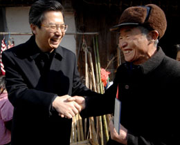 1月1日,75歲的老人何沛昌(左)由于身體不好,無法到村里領(lǐng)養(yǎng)老金,浙江省余姚市委書記王永康(右)步行來到何家,把養(yǎng)老金存折交到了何沛昌手中。新華社記者:王小川
